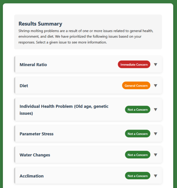 Rather than guessing, use a systematic approach to identify the most likely cause. Our free Shrimp Tank Troubleshooting app helps prioritize possible causes of molting problems and offers specific solutions for each, helping you address issues methodically rather than throwing random solutions at the problem.