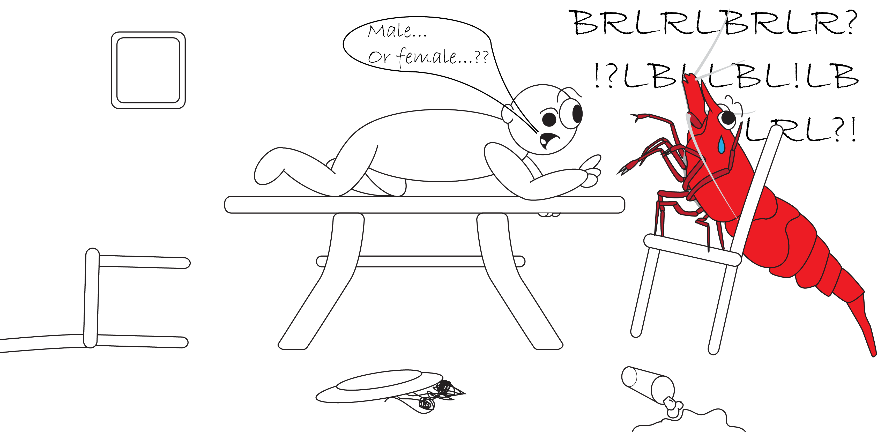 Look ‘em right in the eye and let ‘em sweat for a second before repeating your question. “Male… or female…?” Be sure to do the pause for dramatic effect. As shown in the scientific illustration below, the shrimp may initially be shocked and unable to communicate clearly. Don’t worry though, they’ll recover and tell you.